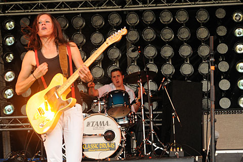 Little Fish opened the Festival on the main stage. The crowd were not quite ready; after a long queue to get in and probably putting up tents and stuff, and choosing their outfits for the evening it's no wonder that most people just sat on the grass looking kind of exhausted. It's a similar set to last night at the Thirst Lodge but new song 'Hope I die young' is put in the middle of the set so that whiplash can get the show off to a more traditional start.