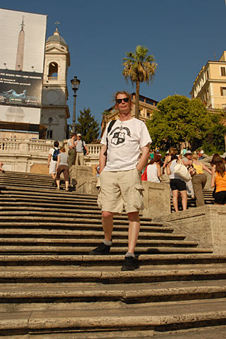 Having changed into shorts and cool stuff we rush off into the afternoon heat. Rushing was a bit of a mistake and crawling is the better option. We end up at the Spanish steps - here's a pic of me in shorts and special t-shirt (taken by Voltane, art-direction and styling by me).