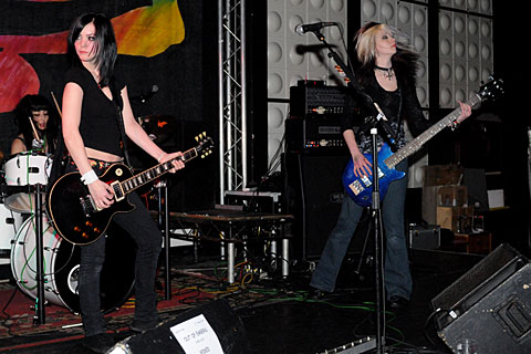 Idle Silver are an all-girl 3 piec; before they start they produce a fan from their luggage. This seems a bit bizarre as its not particularly warm (its smnowing outside), but when they get going it certainly heats up and the fan performs a necessary function. These girls certainly have tremendous energy. Lots of head-banging and generally thrashing around, which I always enjoy trying to capture with my camera.